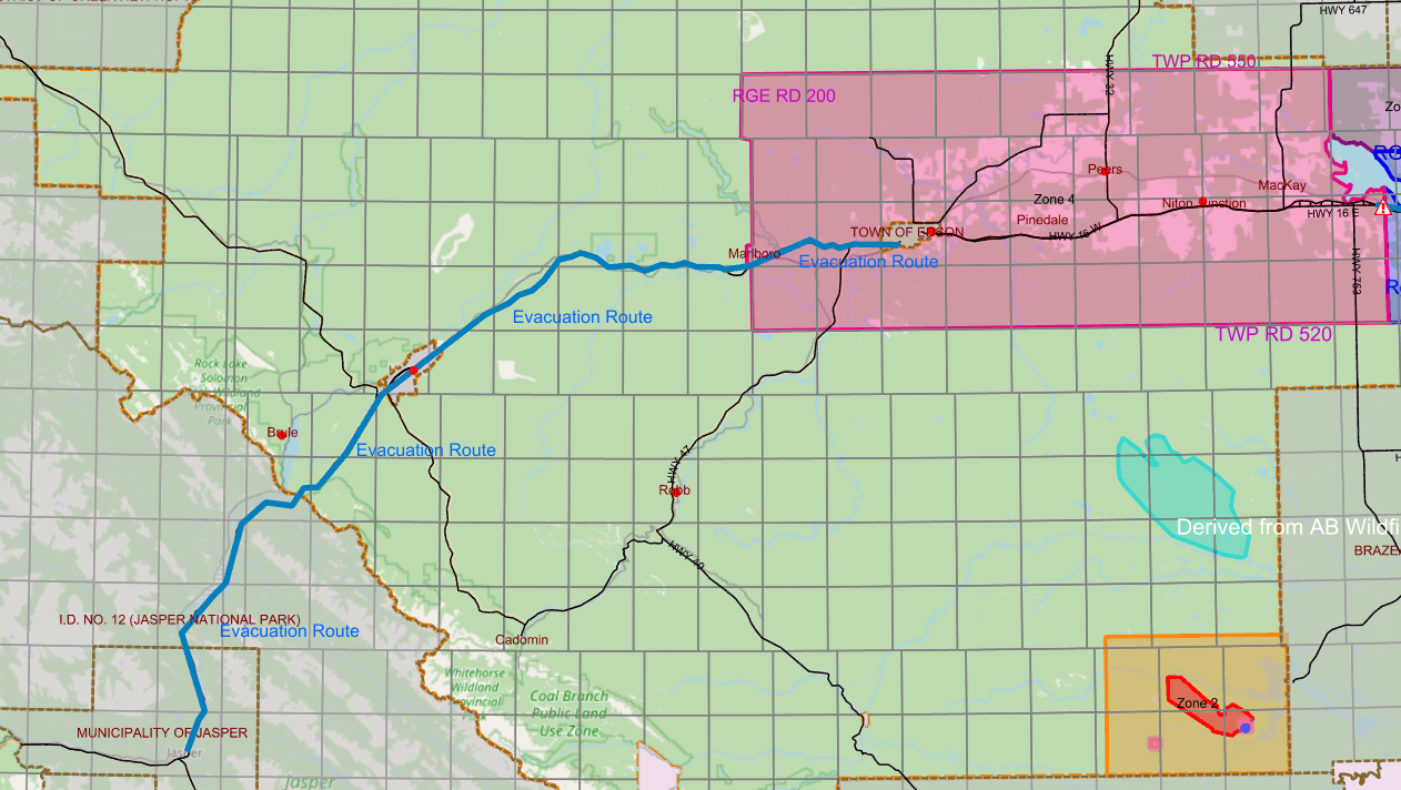 Area: Western boundary of the evacuation zone is Marlboro and Range Road 200 all the way to the East of Yellowhead County. Northern boundary is Township Road 550 and southern is Township Road 520. This evacuation includes the town of Edson.