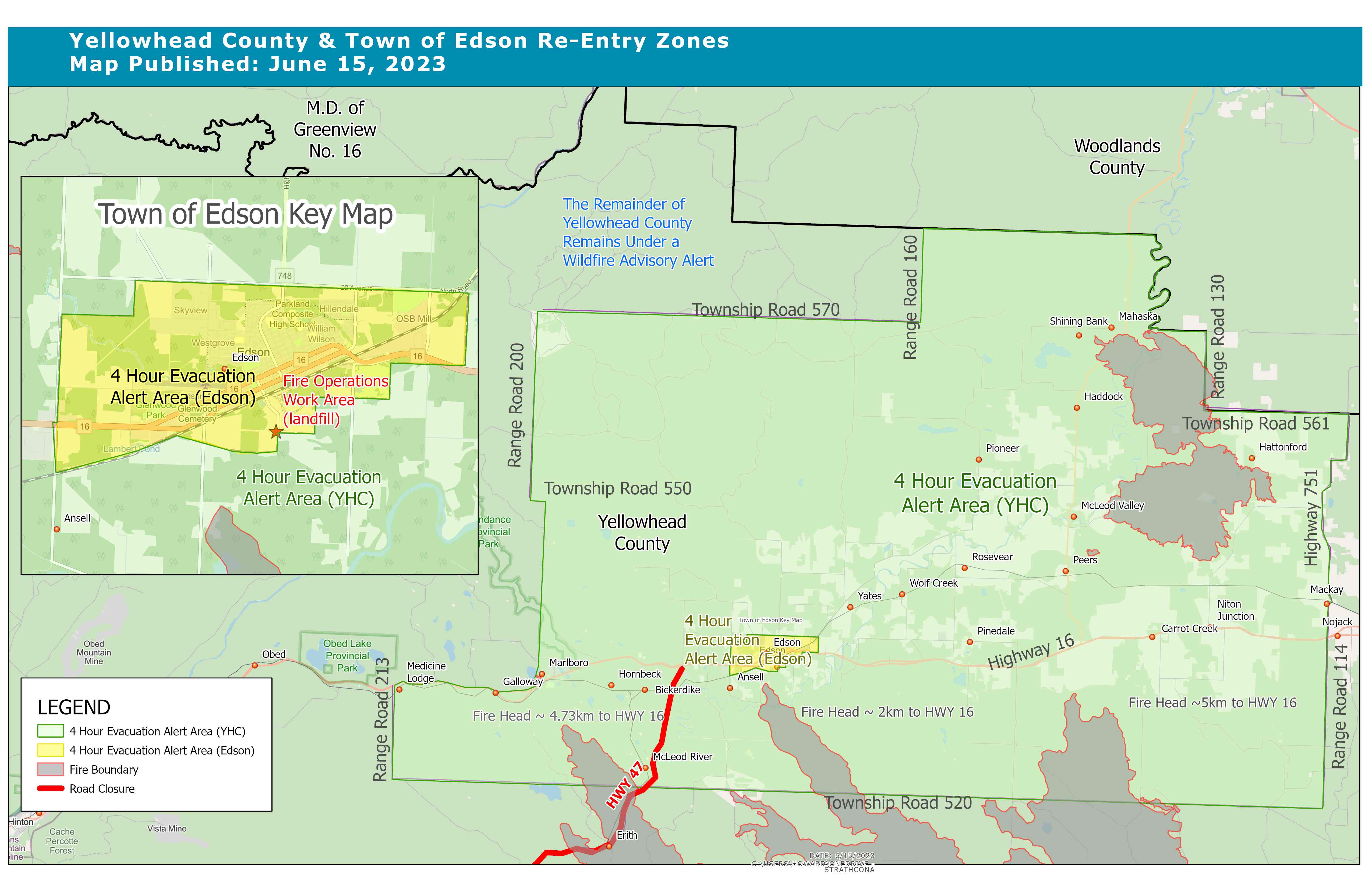 Description: Yellowhead County cancelled the 4-hour evacuation advisory for parts of Yellowhead County around the Edson area as fires are Being Held.