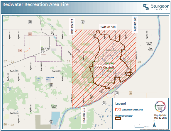 The Evacuation Order remains in effect for everyone between Range Road 213 East to Range Road 203, and Township Road 580 and the North Saskatchewan River to the south. See attached map for details.