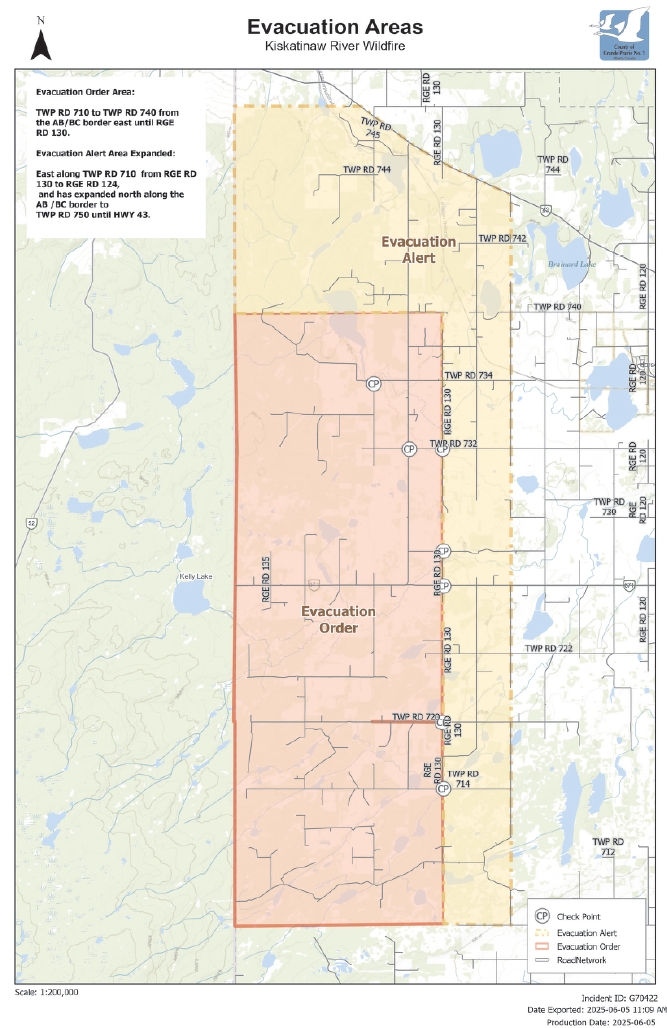 Area: The evacuation order is in effect for everyone located north of Township Road 710 to Township Road 740, east of the BC/Alberta border to Range Road 130. The evacuation alert has expanded east along Township Road 710, From Range Road 130 to 124 and has expanded north along British Columbia/Alberta border to Township Road 750 until Highway 43.