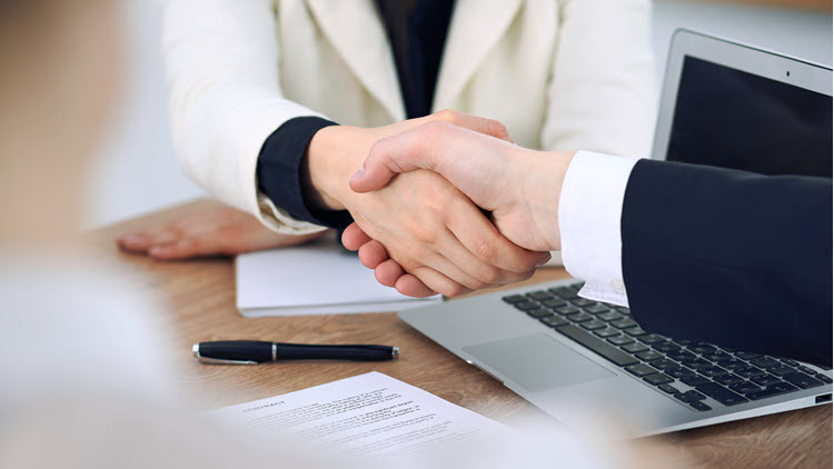 Arms and hands of 3 people sitting at a table pointing at a document for the person holding a black pen to sign